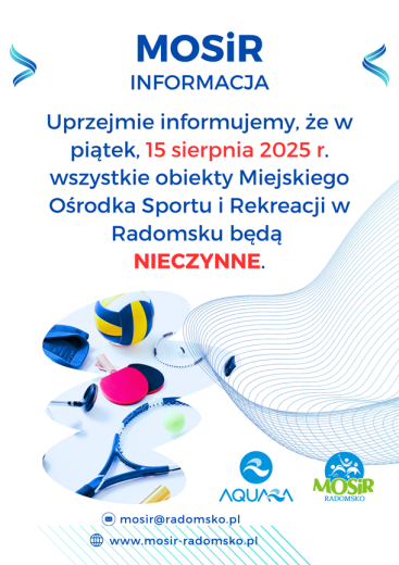 📢 Uprzejmie informujemy, że w piątek, 15 sierpnia 2025 r. wszystkie obiekty Miejskiego Ośrodka Sportu i Rekreacji w Radomsku będą NIECZYNNE.