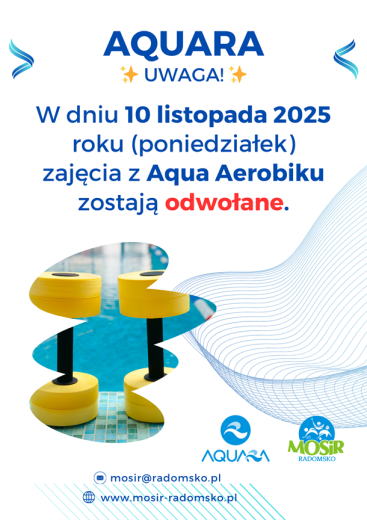 Informujemy, że w poniedziałek 10 listopada 2025 r. zajęcia z aqua aerobiku zostają odwołane.