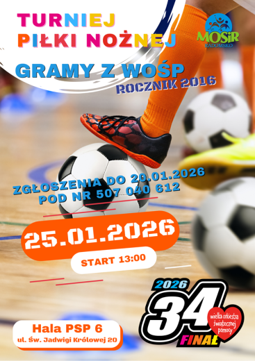 Miejski Ośrodek Sportu i Rekreacji w Radomsku zaprasza do udziału w Turnieju Piłki Nożnej „Gramy z WOŚP”, który łączy sportową rywalizację z pomaganiem!
