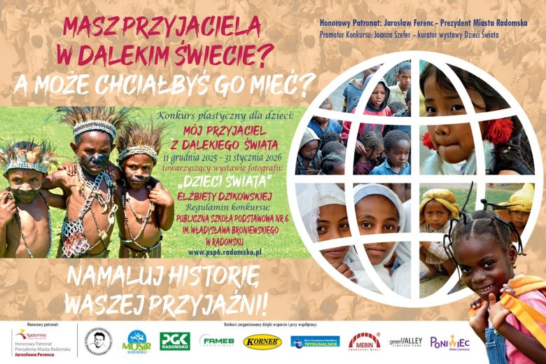 Publiczna Szkoła Podstawowa nr 6 im. Władysława Broniewskiego i Miejski Ośrodek Sportu i Rekreacji w Radomsku, serdecznie zapraszają od 10 grudnia 2025 do 15 stycznia 2026, radomszczańskie dzieci na wielkoformatową i edukacyjną wystawę fotografii «Dzieci Świata» Elżbiety Dzikowskiej. Wystawa jest ogólnodostępna i nieodpłatna. Wystawie towarzyszy konkurs plastyczny "Mój przyjaciel z dalekiego świata" dla dzieci w wieku od lat 6 do 15. Prace można przesyłać do 31 stycznia 2026. Regulamin pod linkiem.