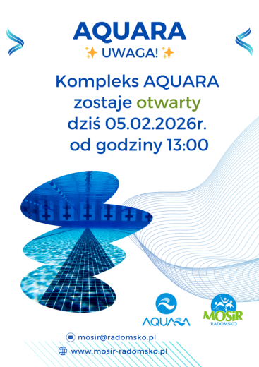 Informujemy, że dziś (05.02.2026 r.) od godz. 13:00 basen w Kompleksie AQUARA zostaje ponownie otwarty dla klientów.